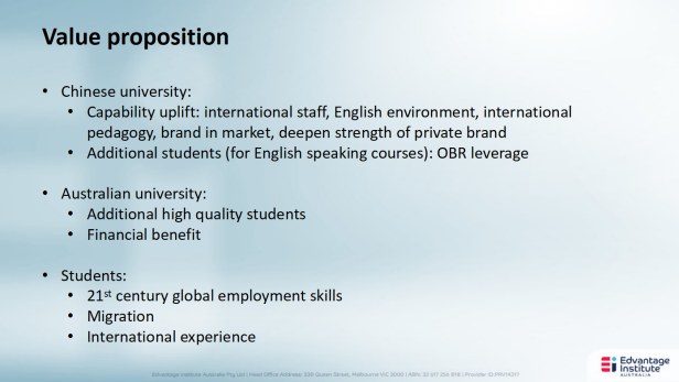 Rhys Williams先生是澳大利亚中汇学院(EIA)国际合作总监,他在澳大利亚的大学及私立机构的跨境教育合作方面拥有丰富的设计和管理经验,曾作为维多利亚大学跨国教育合作(TNE)总监,管理澳大利亚大学领域规模最大、用途最广的TNE系列项目。Rhys先生通过与中国、马来西亚、越南、新加坡、斯里兰卡和印度等国的多个组织机构建立的合作伙伴关系,每年帮助8000多名国际学生获得澳大利亚奖学金和学费优惠。